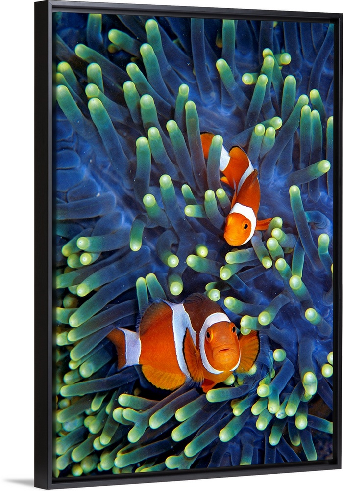 <p>Portrait, oversized photograph of two clownfish swimming through the vibrant, glowing tentacles of a sea anemone.</p>