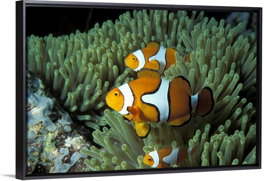 <p>This large artwork consists of several clown fish swimming through ocean vegetation.</p>