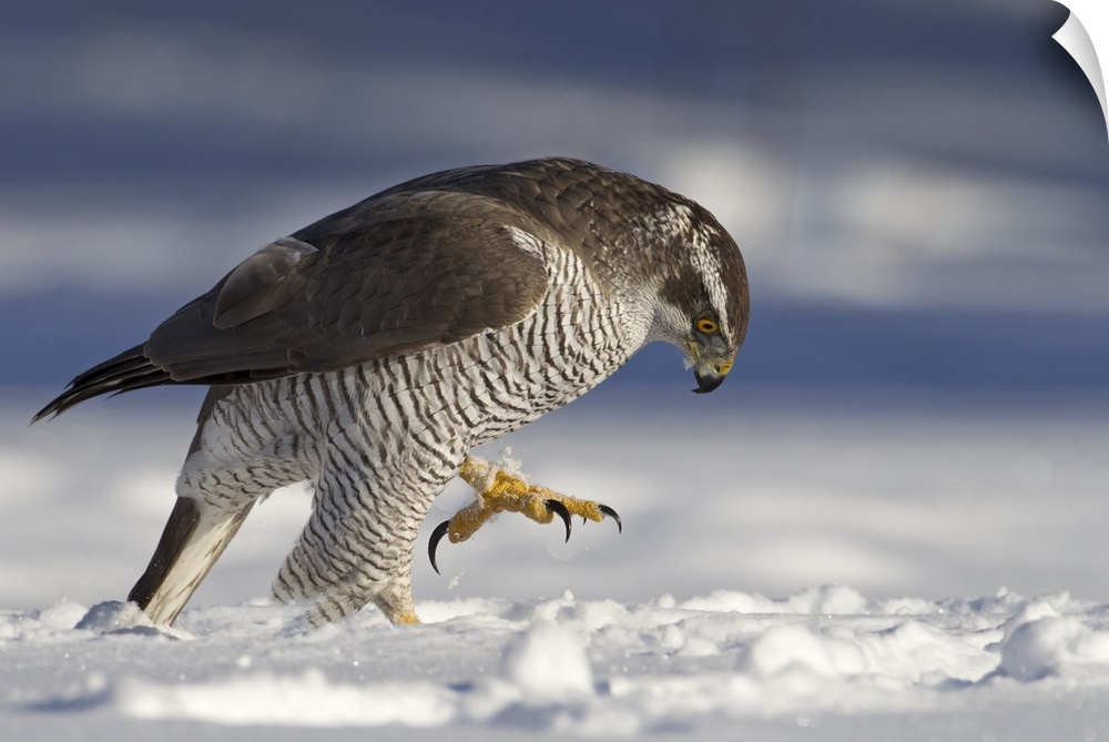 <p>A large Goshawk looks intensely at something in the snow, with talons extended.</p>