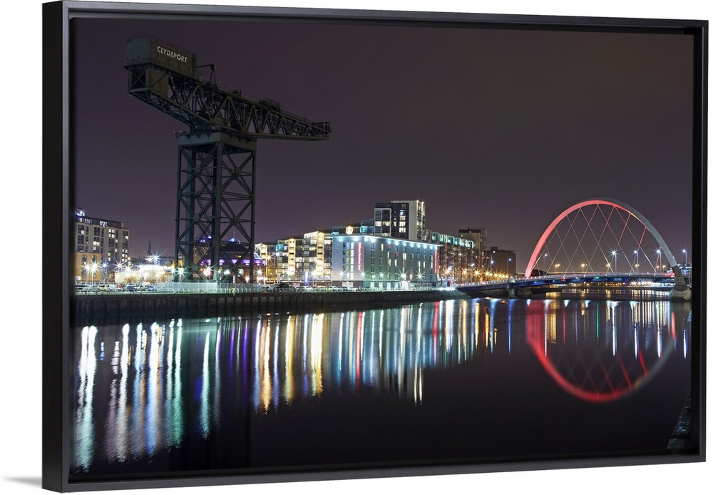 <p>View of Finnieston Crane and Clyde arc bridge on the River Clyde at night</p>