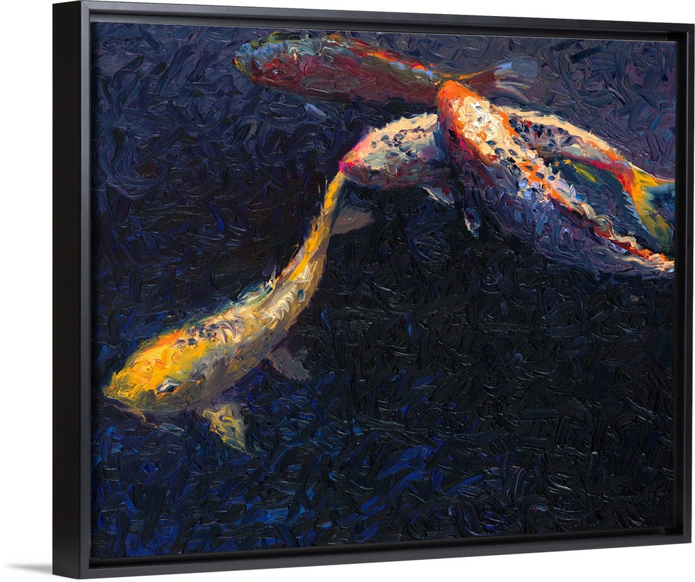 <p>Brightly colored contemporary artwork of fish swimming in dark water.</p>