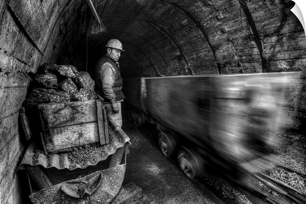<p>coal miners watching a mining cart whiz by in a cave.</p>