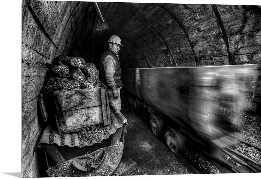 <p>coal miners watching a mining cart whiz by in a cave.</p>