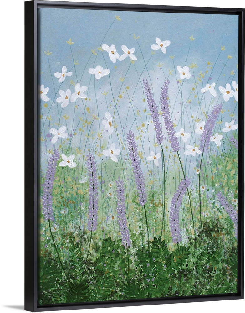 <p>Contemporary painting of purple, white, and yellow wildflowers in a grassy field with a dusty blue sky.</p>