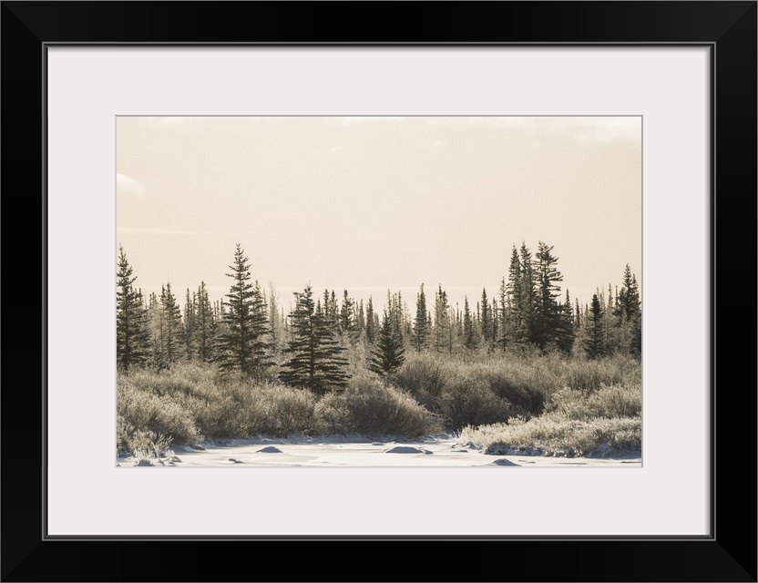 <p>Cold afternoon along the coast line of Hudson Bay. The trees have a thin layer of frost on them, Churchill, Manitoba, Canada</p>