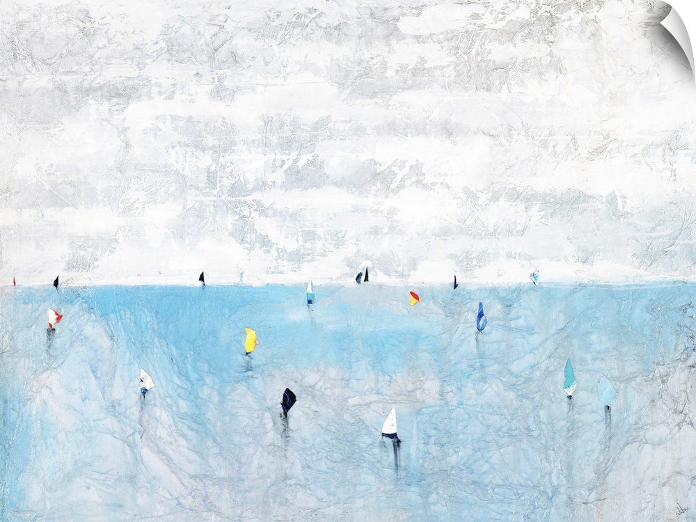 <p>Contemporary abstract painting using pale colors to make a sea filled sailboats.</p>