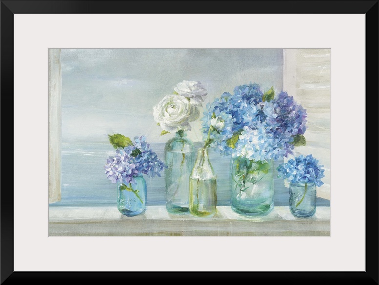 <p>Contemporary still-life painting of a blue and white flowers in glass bottles and jars.</p>