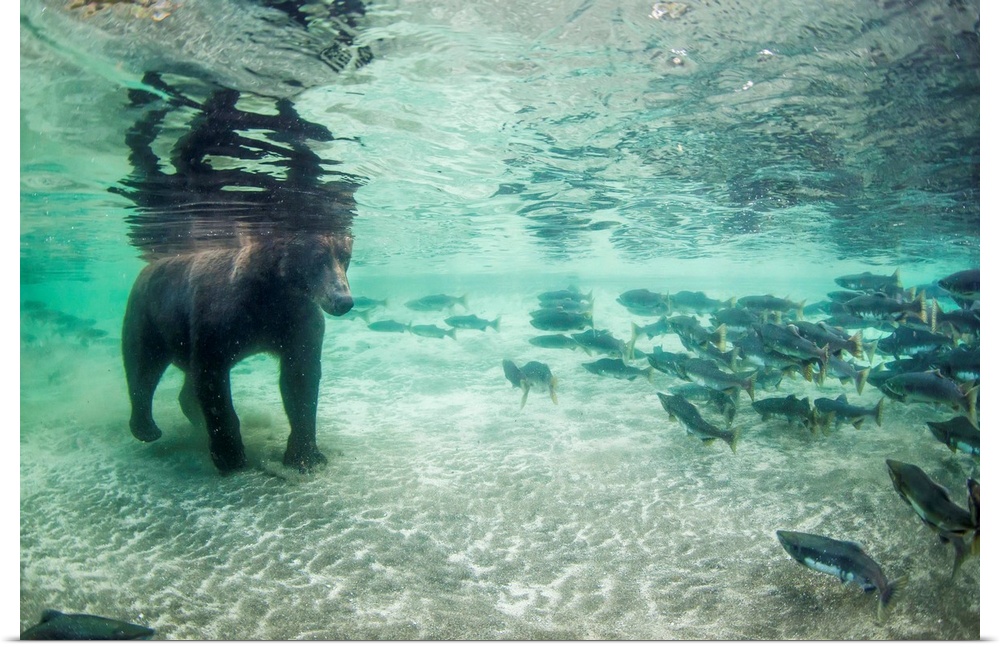 <p>Underwater view of Coastal Brown Bear (Ursus arctos) fishing for spawning salmon in stream, Katmai National Park, Alaska.</p>