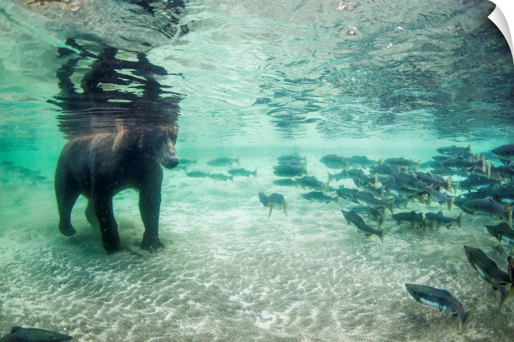 <p>Underwater view of Coastal Brown Bear (Ursus arctos) fishing for spawning salmon in stream, Katmai National Park, Alaska.</p>