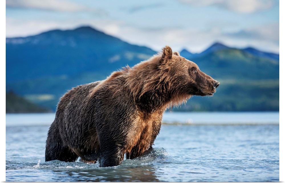 <p>Coastal Brown Bear (Ursus arctos) standing in salmon spawning stream by Kukak Bay, Katmai National Park, Alaska.</p>