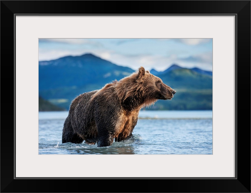<p>Coastal Brown Bear (Ursus arctos) standing in salmon spawning stream by Kukak Bay, Katmai National Park, Alaska.</p>