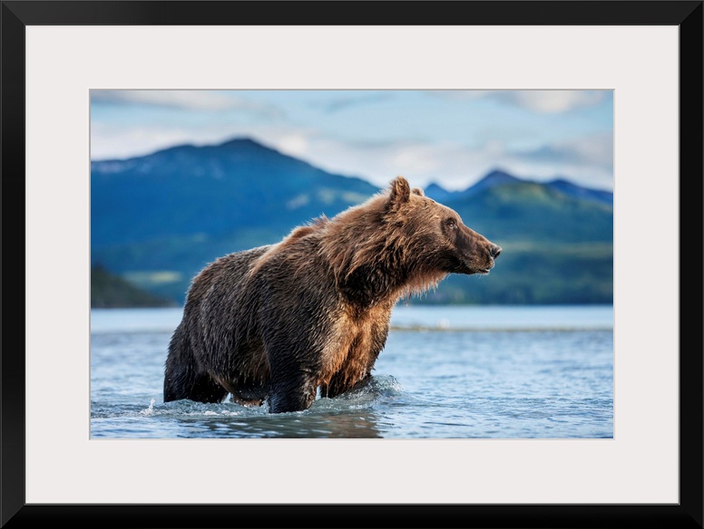 <p>Coastal Brown Bear (Ursus arctos) standing in salmon spawning stream by Kukak Bay, Katmai National Park, Alaska.</p>