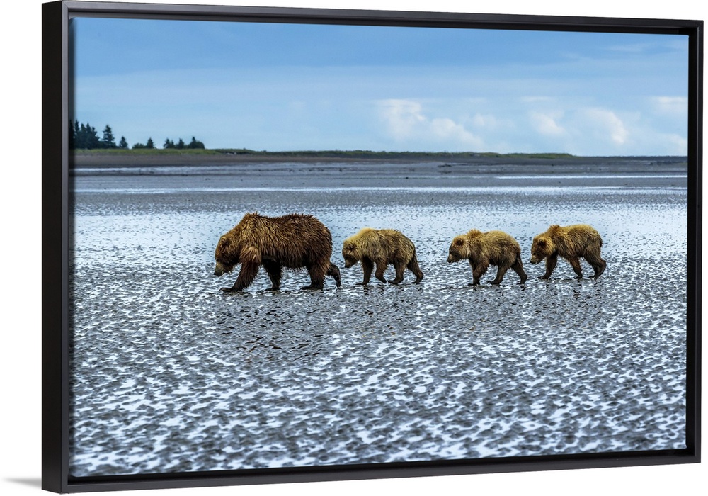 <p>Coastal brown bears, Ursus arctos, walking across a tidal flat after digging and eating clams at Sliver Salmon Creek in Lake Clark National Park, Alaska.</p>