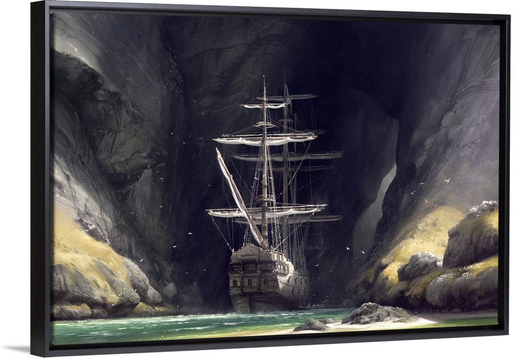 <p>Painting of a pirate ship exploring a large coastal cave.</p>