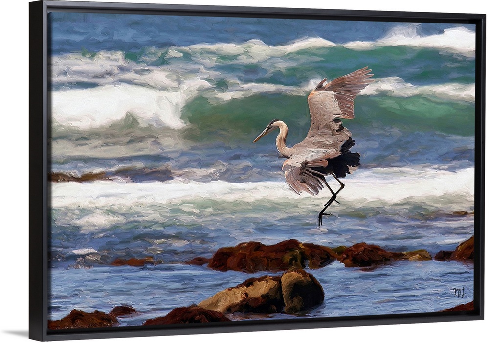<p>Walking along the ocean in Pebble Beach, one is often surrounded by wildlife, from pelicans gliding above the waves to migrating whales traveling along the coastline a few miles out to sea. In this beautiful artwork, a Blue Heron gracefully comes in for landing, its wings and feathers making its movements precise.</p>