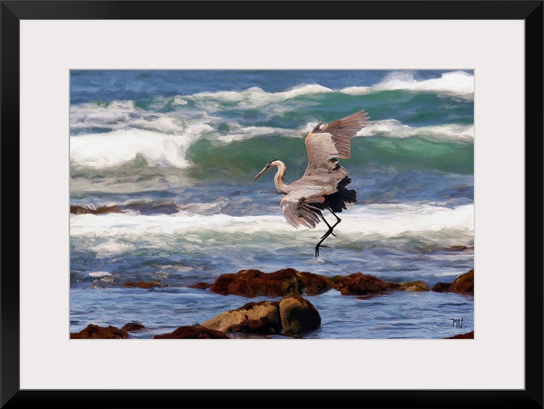 <p>Walking along the ocean in Pebble Beach, one is often surrounded by wildlife, from pelicans gliding above the waves to migrating whales traveling along the coastline a few miles out to sea. In this beautiful artwork, a Blue Heron gracefully comes in for landing, its wings and feathers making its movements precise.</p>