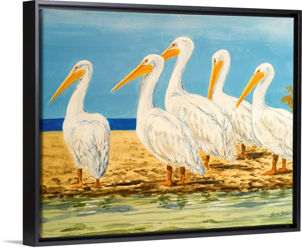 <p>Contemporary painting of a group of pelicans standing on a beach.</p>