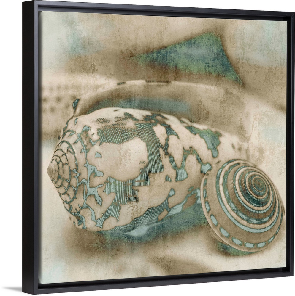 <p>Square decor with cream and tan seashells that have teal highlights.</p>