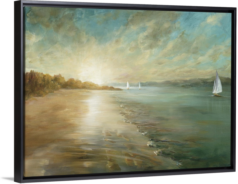 <p>Contemporary artwork of a sandy beach at low tide in morning light.</p>