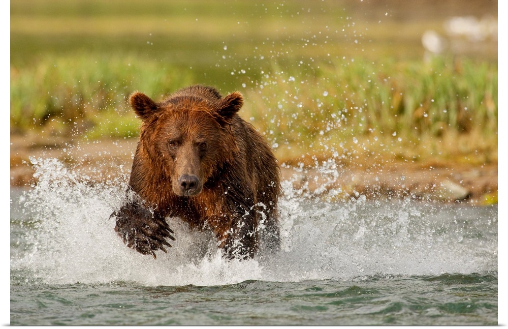 <p>Coastal grizzly boar fishing at geographic harbor, Katmai national park, Alaska.</p>