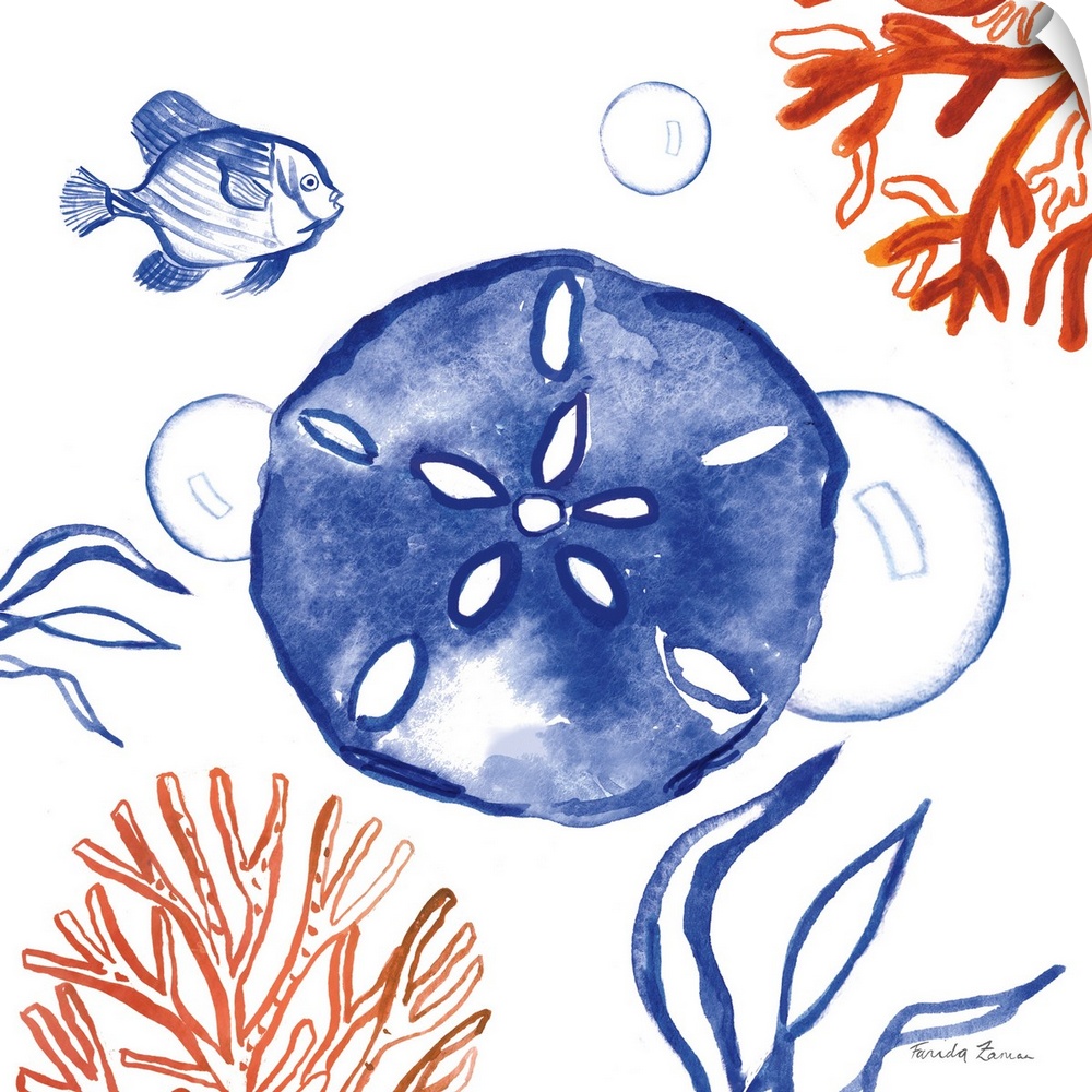 <p>Square beach decor in coral, red, blue, and white hues with a sand dollar, fish, bubbles, coral, and seaweed.</p>