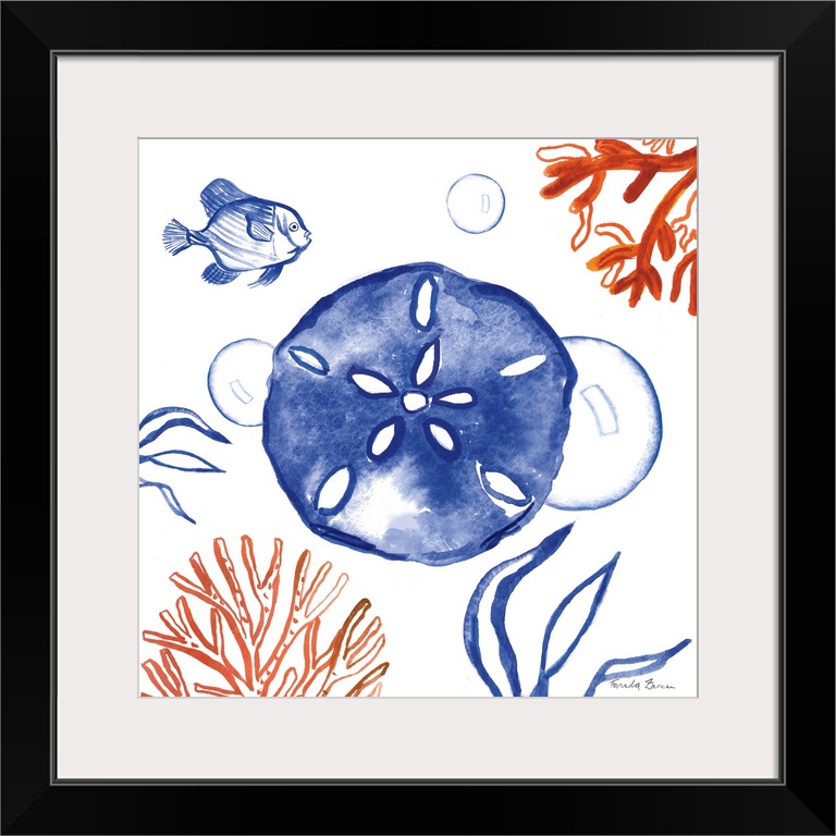 <p>Square beach decor in coral, red, blue, and white hues with a sand dollar, fish, bubbles, coral, and seaweed.</p>