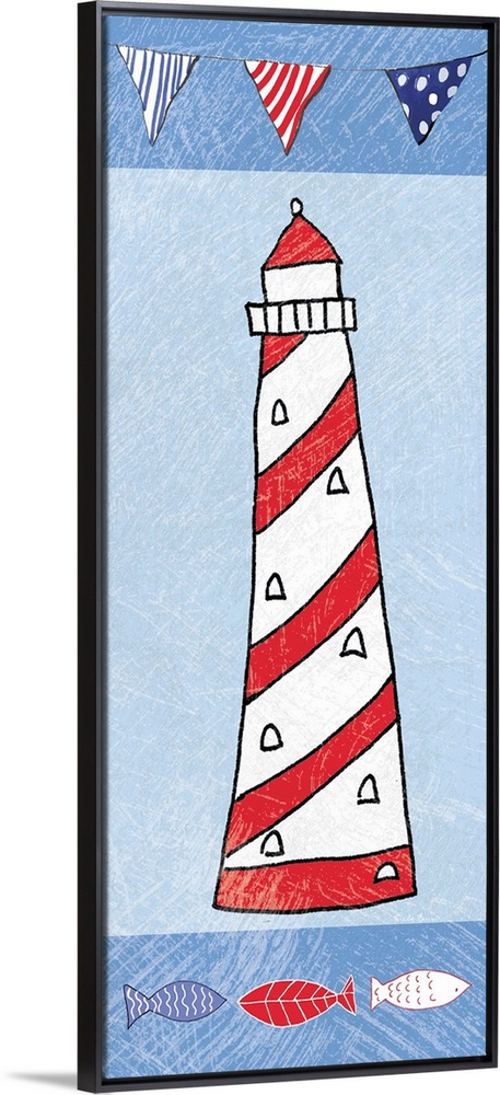 <p>A vertical digital illustration of a white and red lighthouse with a textured effect.</p>