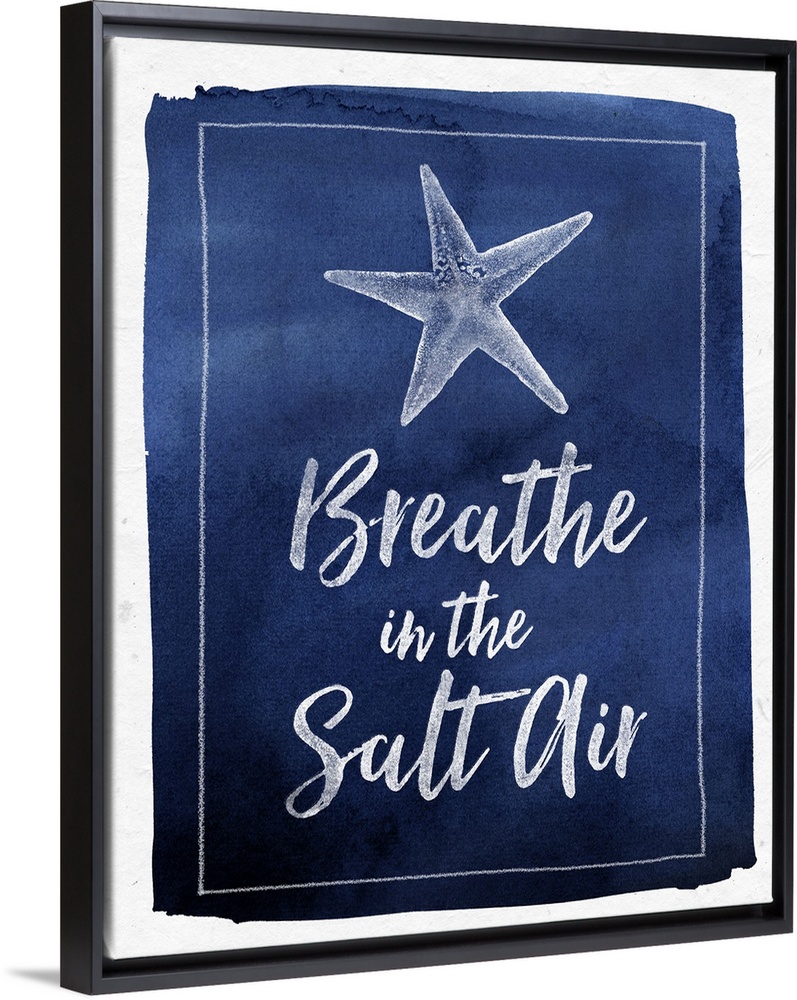 <p>"Breathe In the Salt Air" with a starfish on blue watercolor background.</p>