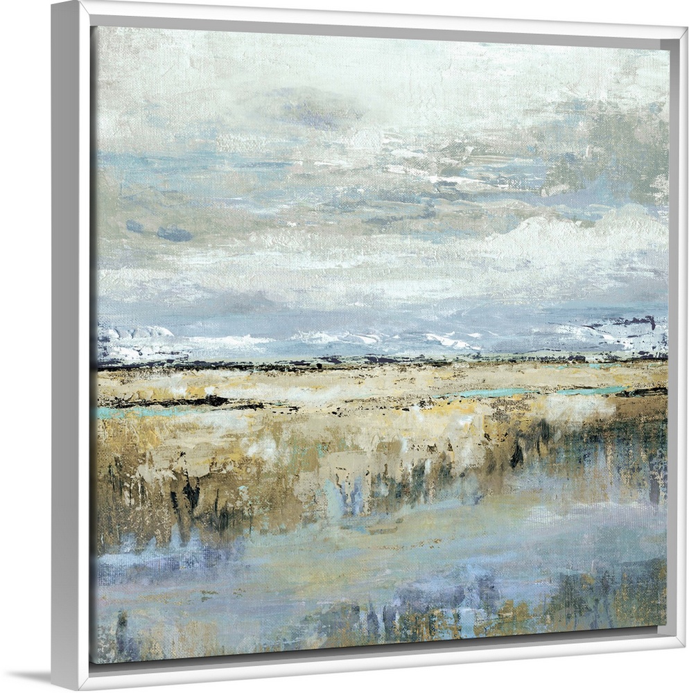 <p>Square abstract painting of a marsh landscape in shades of brown, blue, yellow, and grey.</p>