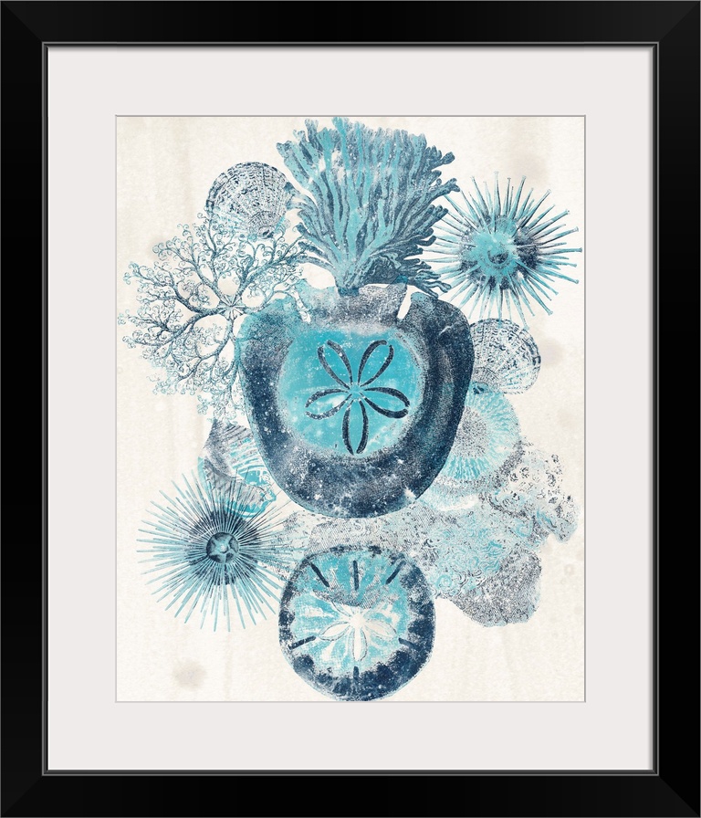 <p>Contemporary beach decor featuring a melange of shells in a variety of blue shades on a neutral background.</p>
