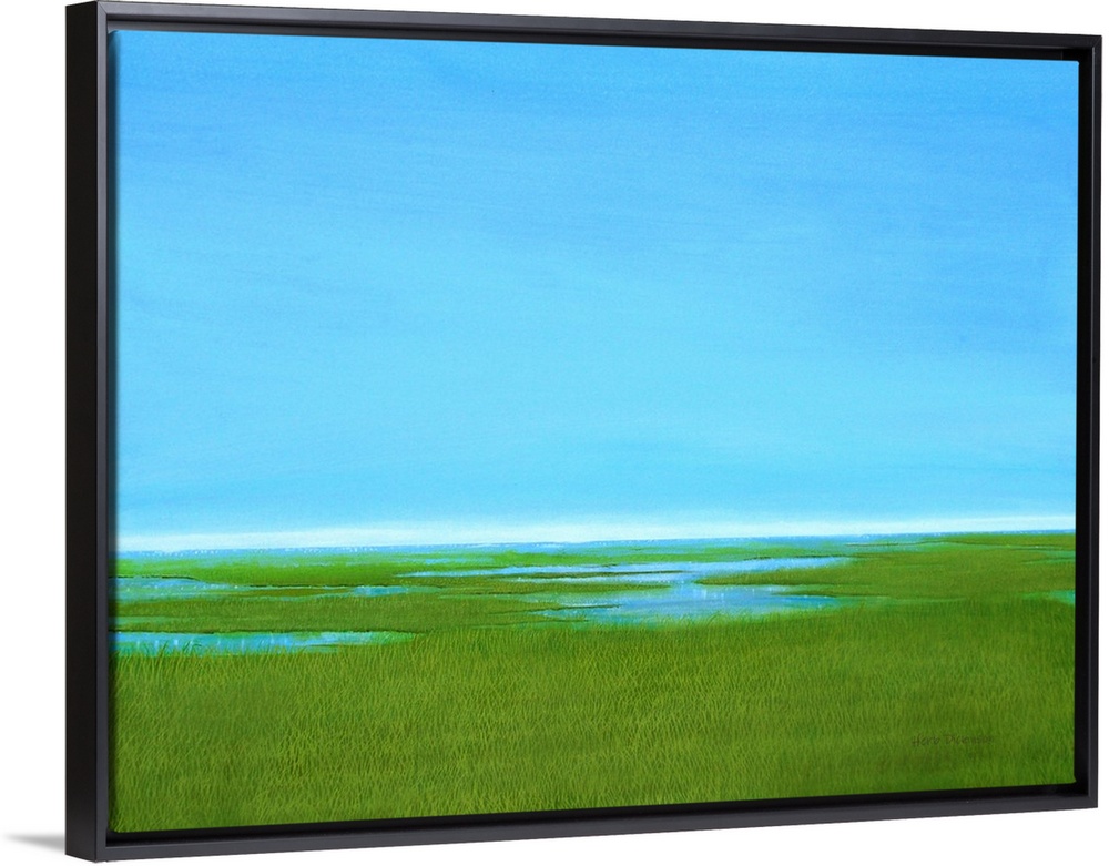 <p>Contemporary painting of a marsh landscape with clear blue skies above.</p>