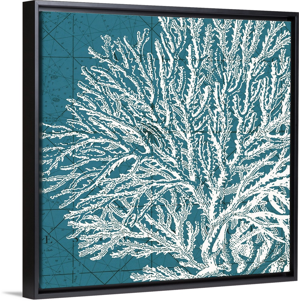 <p>Wall docor featuring a stamped impression of a piece of coral on top of a coastal map.</p>