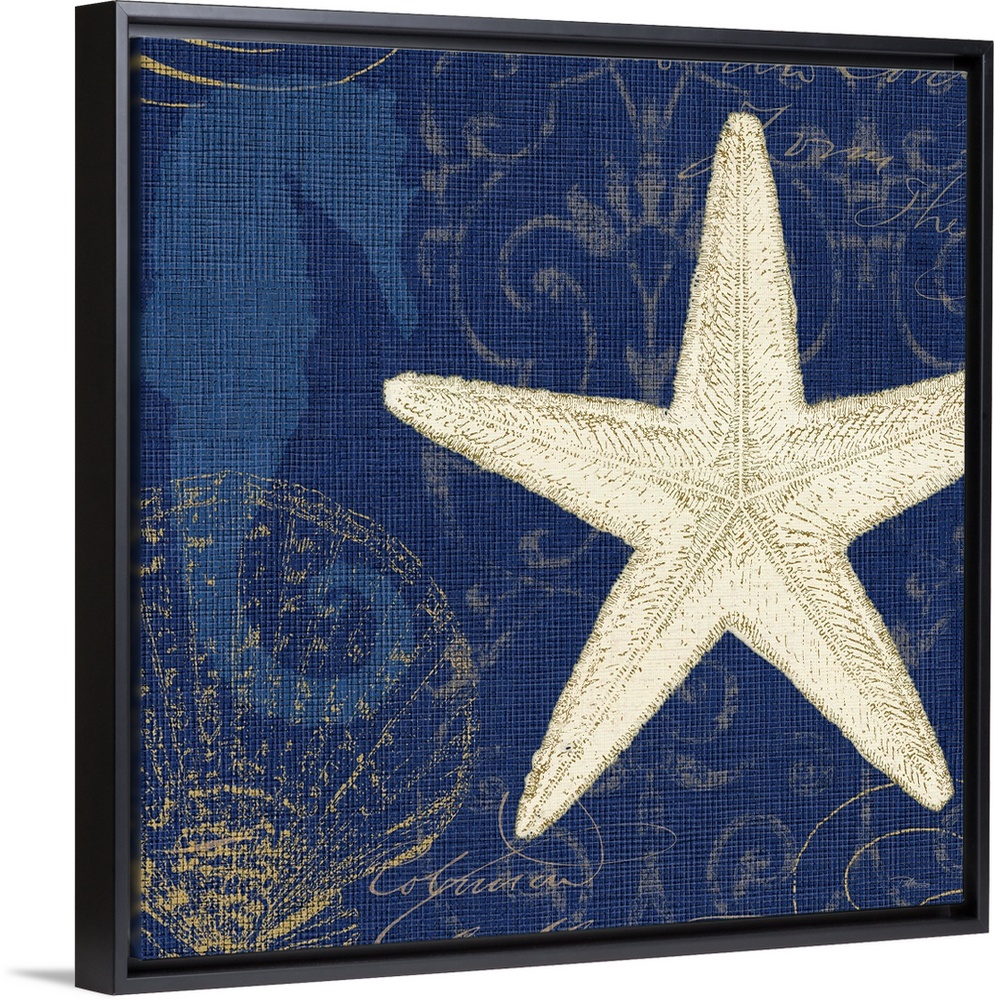 <p>Contemporary artwork of a starfish with other types of sea life against a blue background.</p>