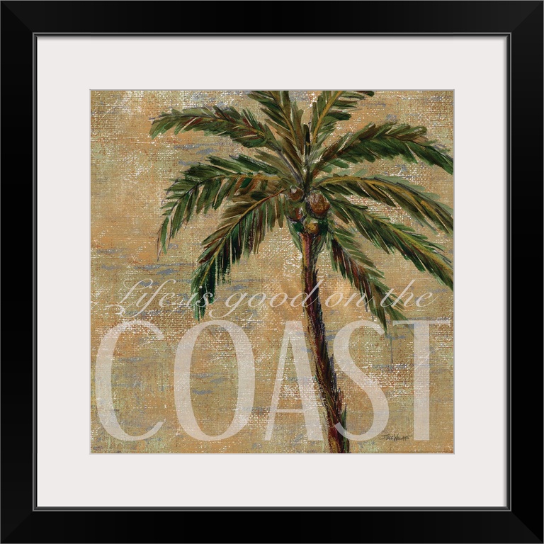 <p>Neutral toned square beach decor with a painting of a palm tree and "Life is good on the Coast" written in white on the bottom.</p>