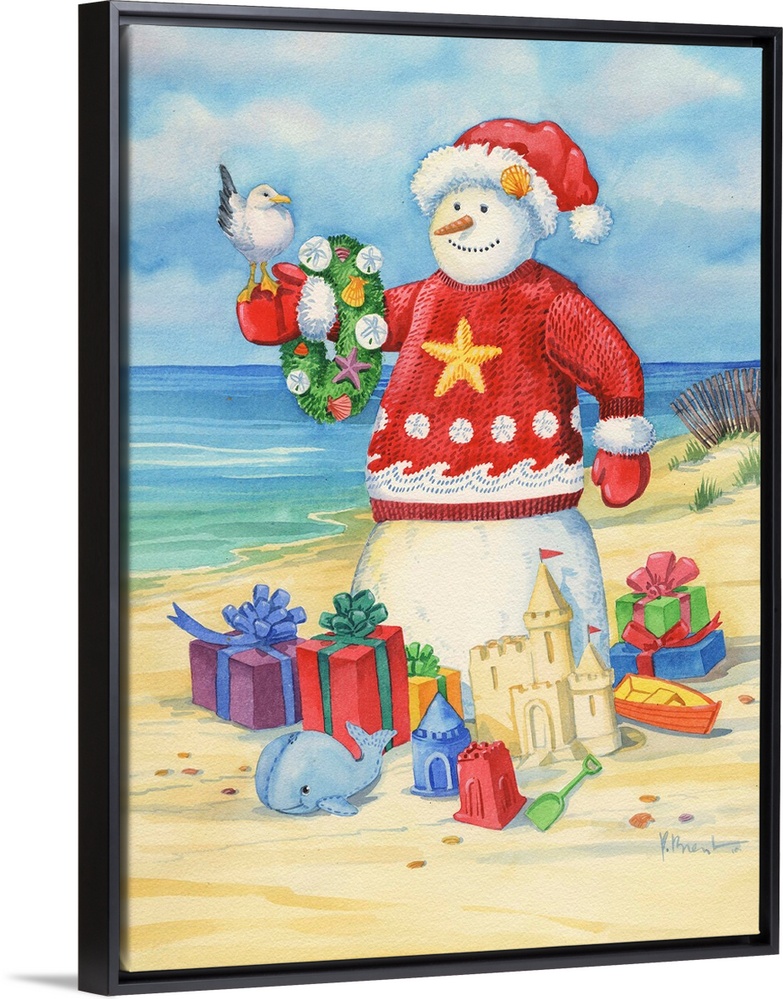 <p>A "snow" man on the beach surrounded by presents and wearing a festive sweater.</p>