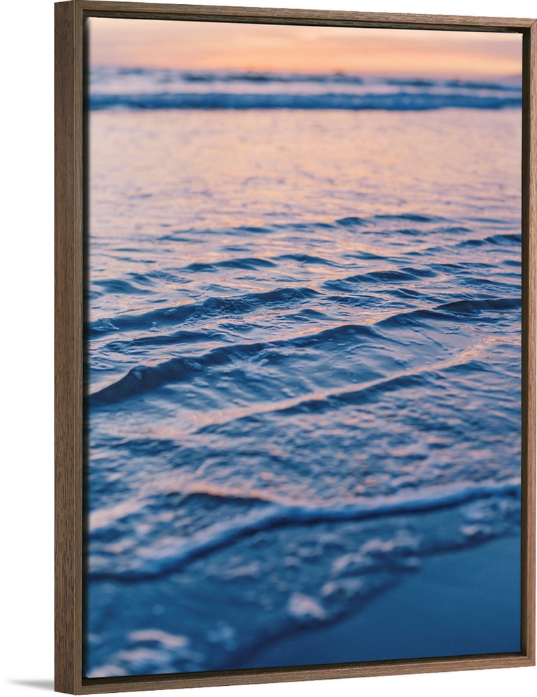 <p>A close up photograph of gentle waves lapping the beach under an early evening sky where the sun is beginning to set.</p>