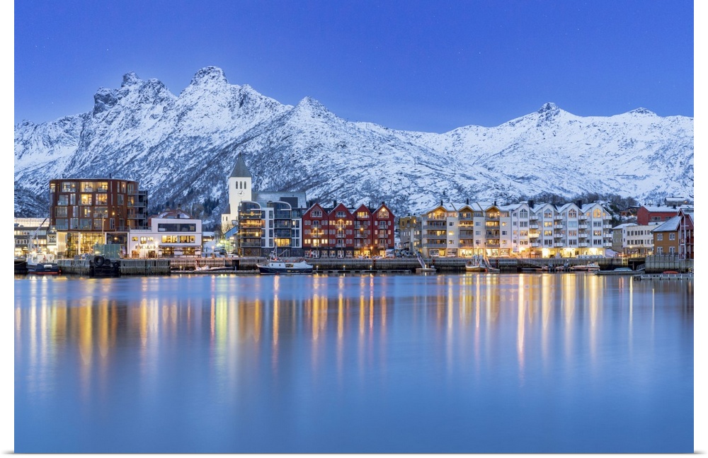 <p>Coastal town of Svolvaer framed by snowcapped mountains at dusk, Nordland county, Lofoten Islands, Norway, Scandinavia, Europe</p>