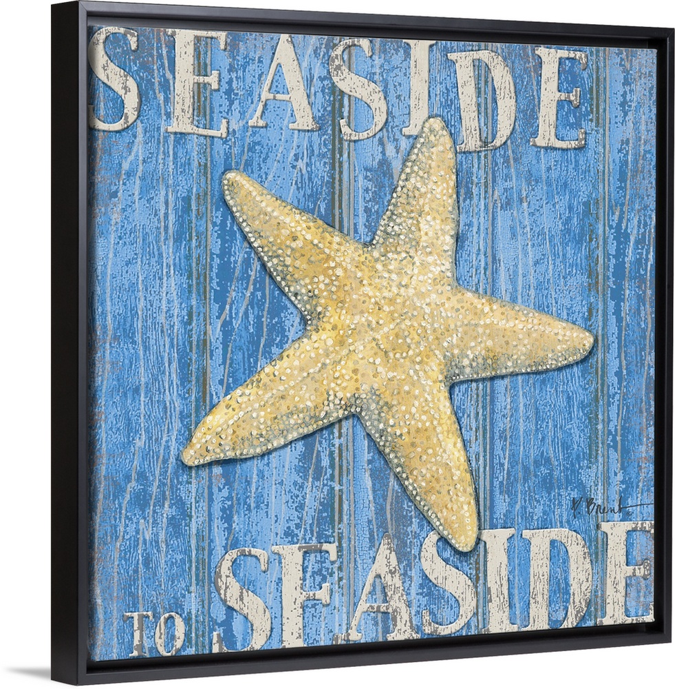 <p>Square painting of a starfish on blue wood panels with the text Seaside to Seaside.</p>