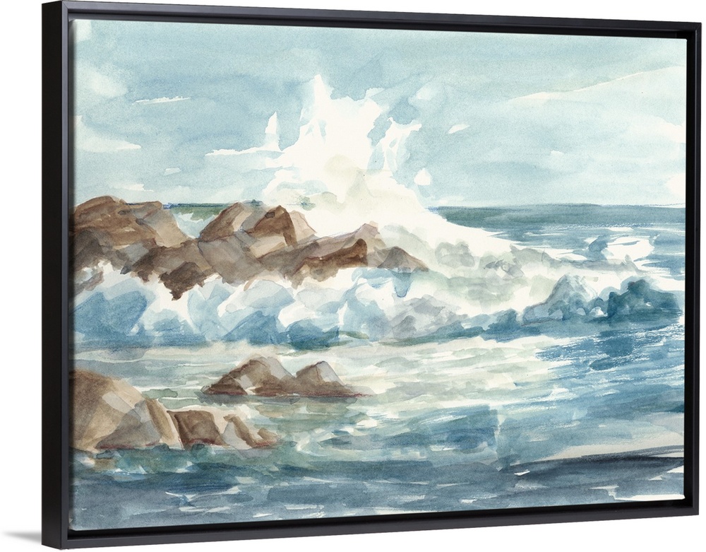 <p>Contemporary painting of waves crashing against a rocky shore.</p>