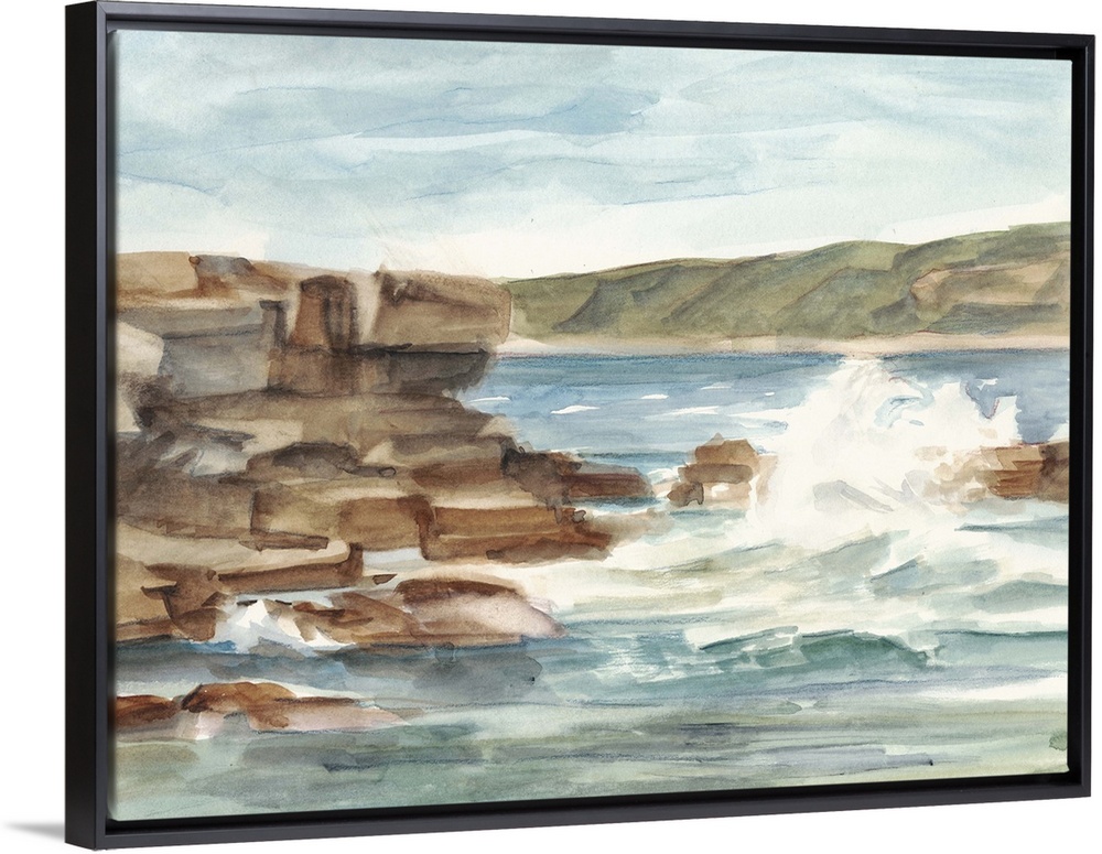 <p>Contemporary painting of waves crashing against a rocky shore.</p>