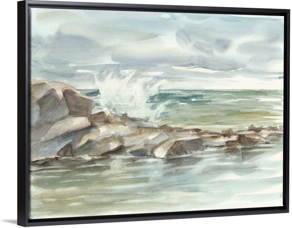 <p>Contemporary painting of waves crashing against a rocky shore.</p>