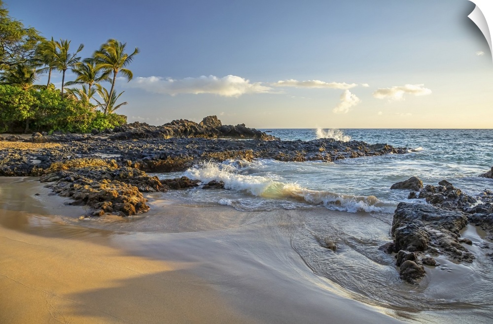 <p>Coastline of Maui with rugged lava rock, a beach and palm trees; Kihei, Maui, Hawaii, United States of America.</p>