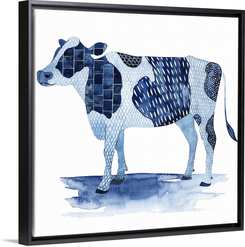 <p>In this contemporary artwork, a pleasant farm animal is adorned by different patterns in shades of blue.</p>