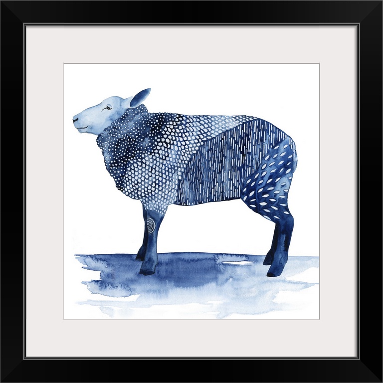 <p>In this contemporary artwork, a pleasant farm animal is adorned by different patterns in shades of blue.</p>
