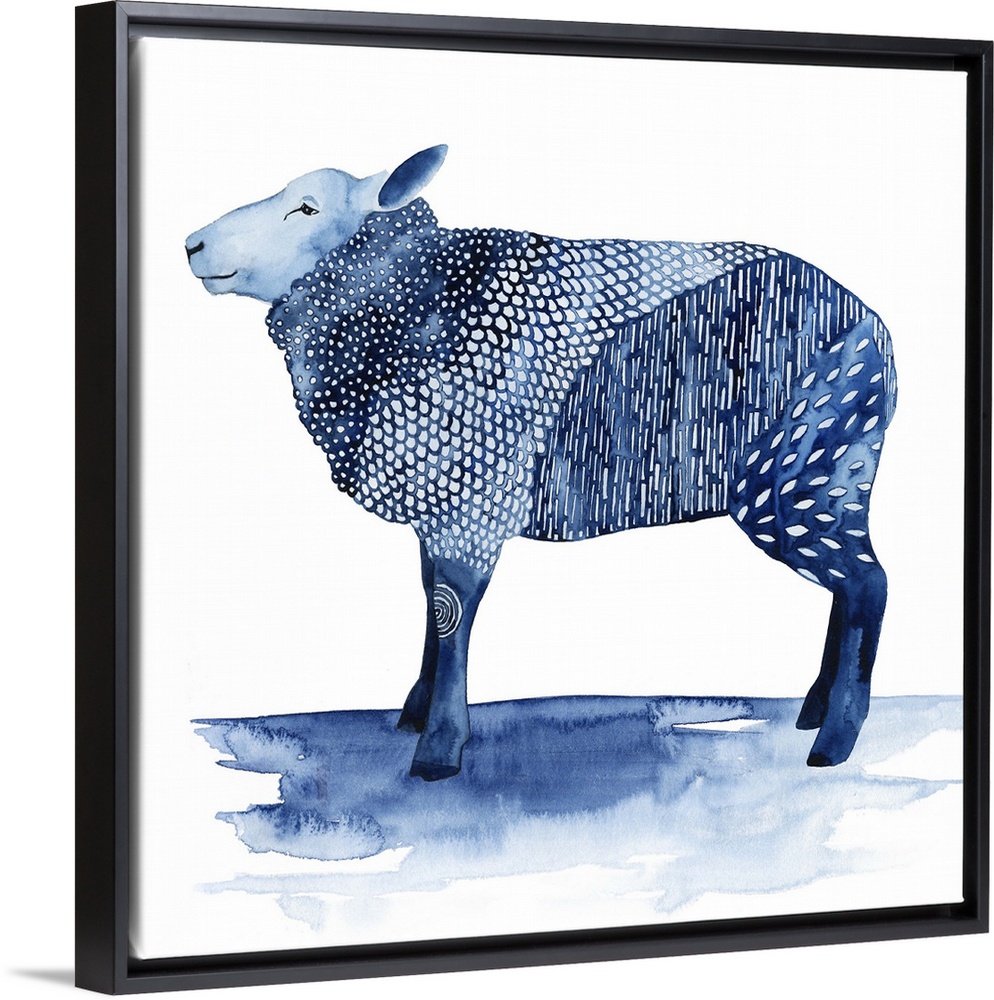 <p>In this contemporary artwork, a pleasant farm animal is adorned by different patterns in shades of blue.</p>
