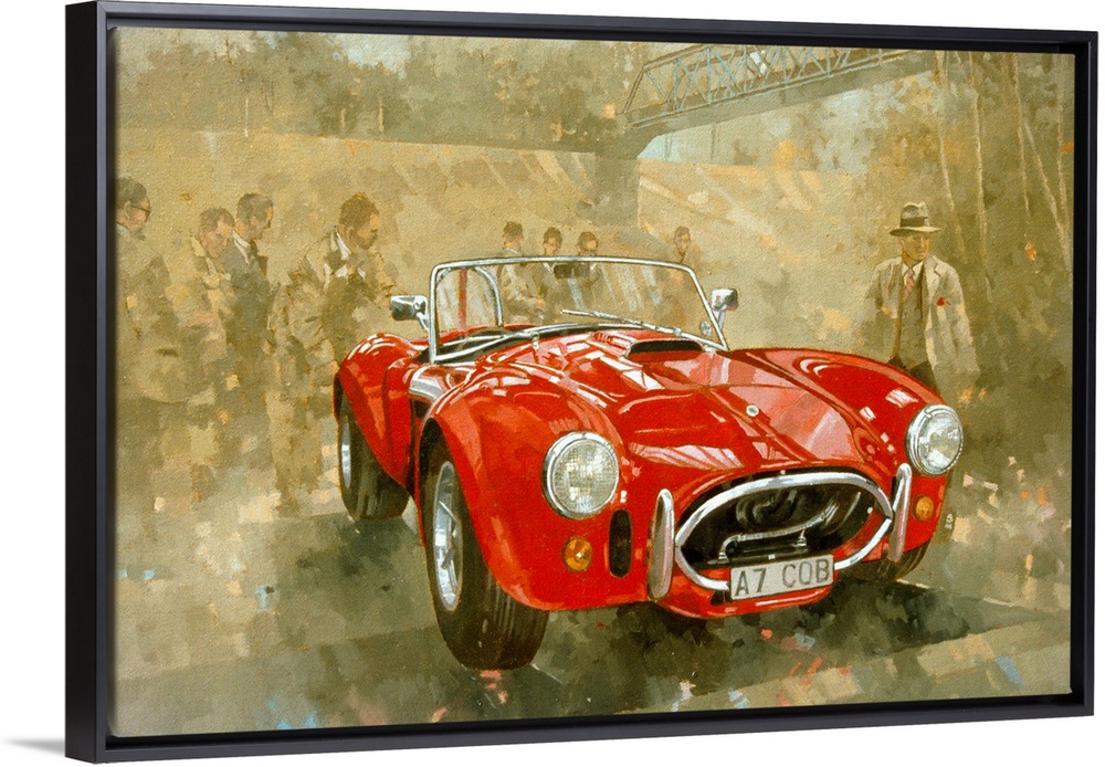 <p>A painting of a gleam vintage British-American sports car surrounded by many admires from the time period.</p>