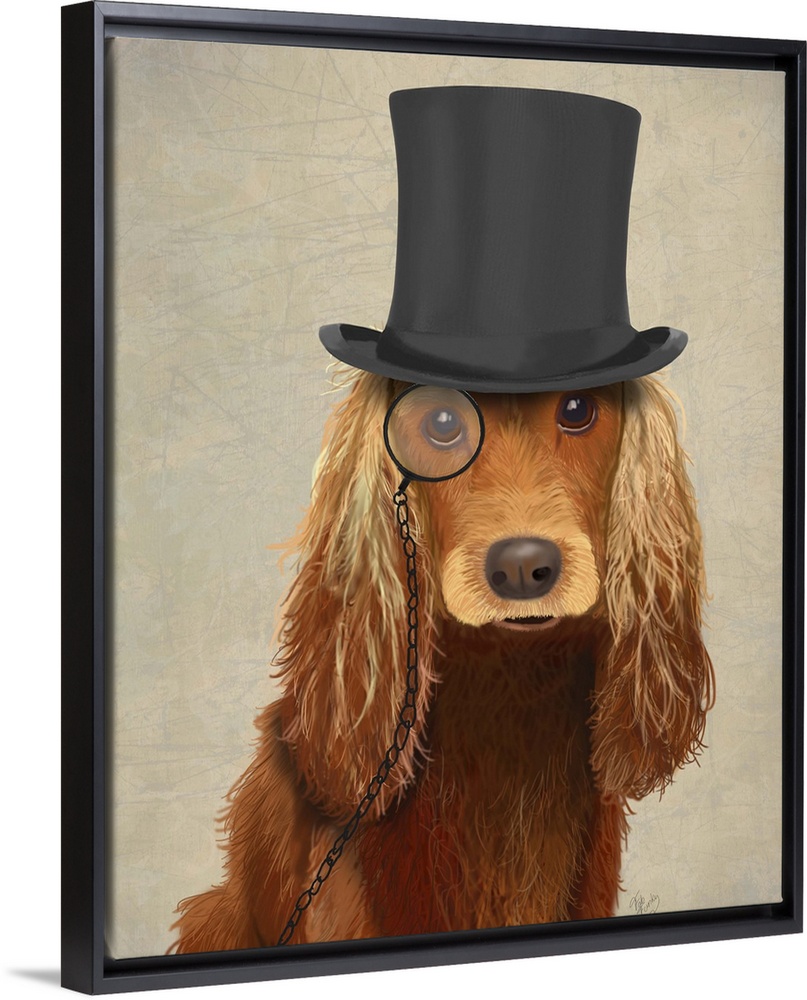 <p>A sharp-dressed cocker spaniel wearing a monocle and top hat.</p>