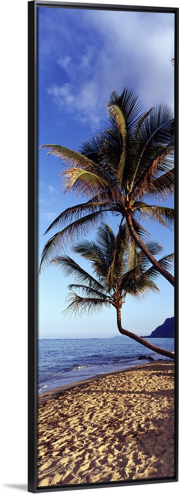 <p>Vertical panoramic image of crooked palm trees sticking out over a sandy beach on a clear day.</p>