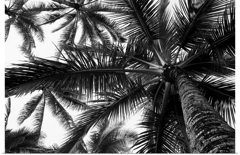 <p>Low angle view of coconut palm trees in black and white; Honolulu, Oahu, Hawaii, United States of America</p>
