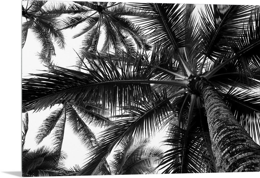 <p>Low angle view of coconut palm trees in black and white; Honolulu, Oahu, Hawaii, United States of America</p>